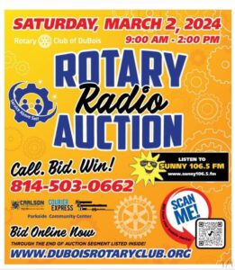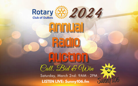 Listen to Sunny 106 on Saturday, March 2nd from 9a-2p to hear all about this year’s auction items donated by local businesses in support of the DuBois Rotary Club. Join Priority Media’s General Manager, Lori Lewis, and other DuBois Rotary members as they host this year’s event. The money raised from this event will stay in DuBois and help local non-profits meet their goals throughout 2024.