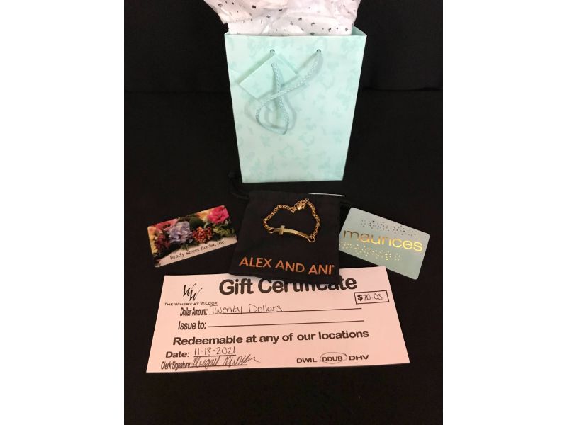Give Her a Beautiful Alex and Ani Cross Bracelet Donated from Dave Rossi’s Jewelry, a Gift Certificate to Brady Street Florist, a Gift Certificate to Maurices, and a Gift Certificate to Winery at Wilcox