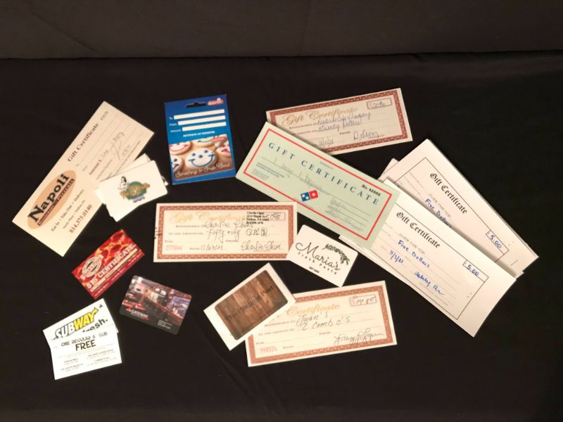 There is Something for Everyone with Amazing Gift Cards from the Following, Bobette, Bucks Pizza, Charlie Chen’s, Dominos Pizza, Eat’n Park, Gateway Cafe, The Hitching Post, Logans Quick Lunch, Maria’s Fresh Pasta, Napoli Pizzeria, (2) to Over the Top, Roadside Cafe, and (2) to Subway