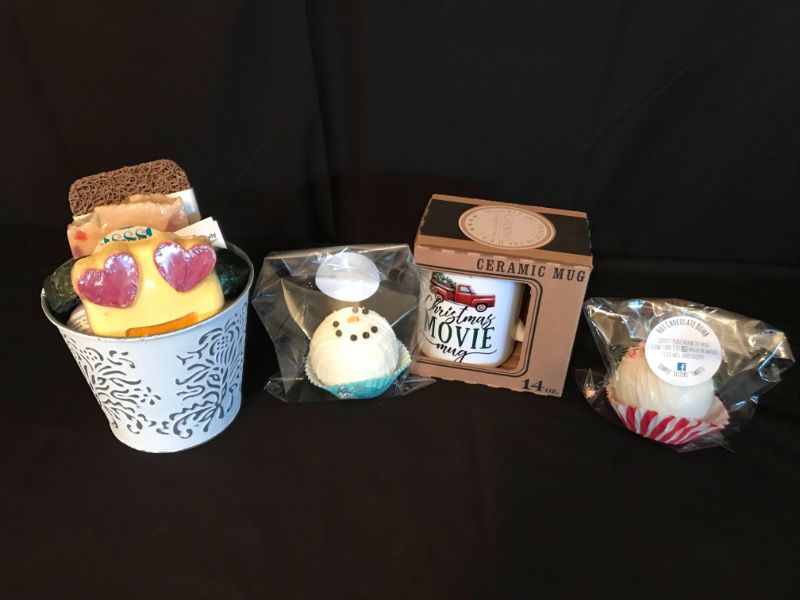 Relax with Some Bath Bombs, Soap, Shower Steamers and a Soap Dish all from Stacy’s Soap Suds and 2 Hot Chocolate Bombs and a Mug from Simple Sister’s Sweets