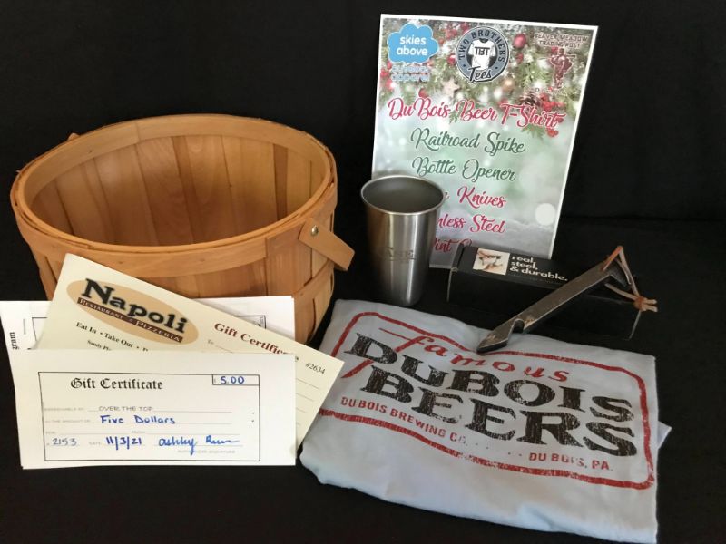 Basket Filled with a DuBois Beer T-Shirt (Size Lg), a Railroad Spike Bottle Opener and a Case Knives Stainless Steel Pint Cup Donated from Two Brothers Tees, a Gift Certificate for a Large Pizza from Napoli Pizzeria and a Gift Certificate to Over The Top