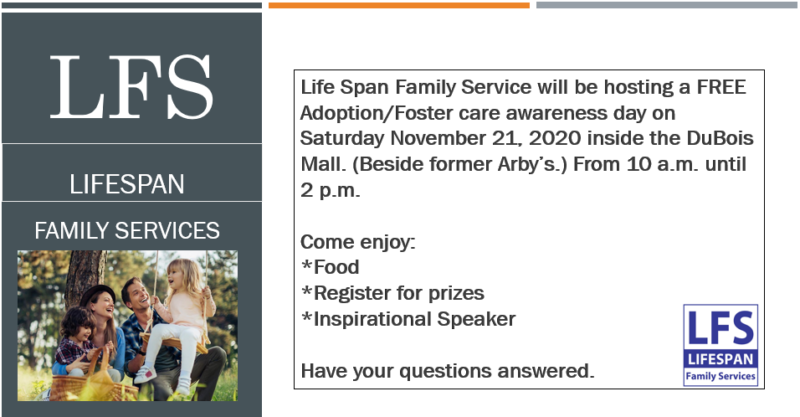 Join Lifespan Family Services in the DuBois Mall on Saturday, November 21st from 10-2pm for their FREE Adoption/Foster Information Session. Enjoy food, prizes, and listen to guest speakers. If you have any questions regarding adoption or fostering a child…bring them for the Q and A session!