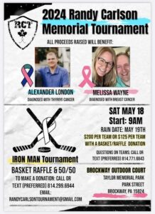 The Randy Carlson Memorial Tournament is a benefit hockey tournament held annually in May. Originally played at the Reynoldsville Rollerdrome, the tournament is now held at the outdoor rink in Brockway. The tournament began as a way to remember former XHL player Randy Carlson, who passed away from melanoma in 2004. This year’s event will benefit two local residents battling cancer: Melissa Wayne and Alex London.