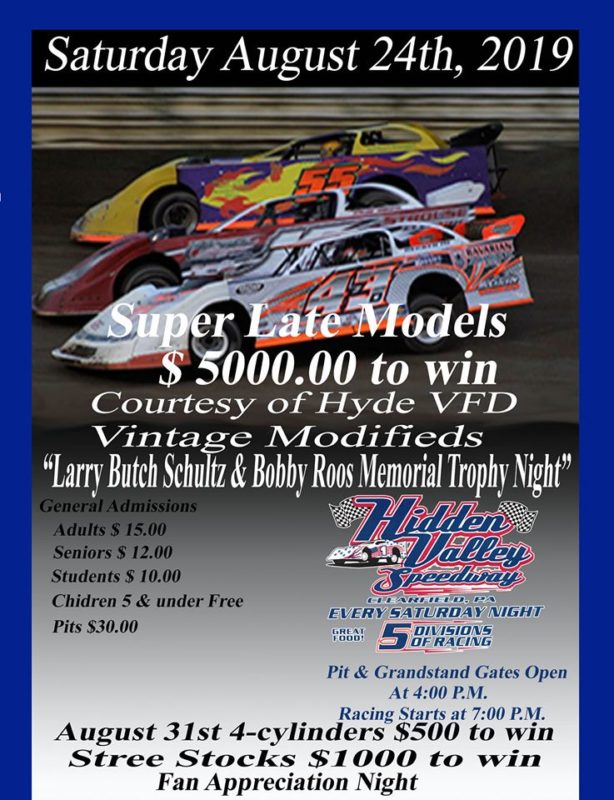 5 Divisions of racing! …gates open at 4 pm – racing starts at 7 pm. This Saturday is Larry Butch Schultz & Bobby Roos Memorial Trophy Night3! Great food and family fun for everyone. Hidden Valley Speedway Mann Road, Clearfield. Get discounted tickets with DuBois Big Deals!