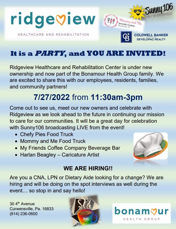Curwensville – Ridgeview Healthcare and Rehabilitation Center in Curwensville is under new ownership: Bonamour Health Group. They held a kickoff party yesterday for residents, their families, and staff as a way to meet face to face with the local community.