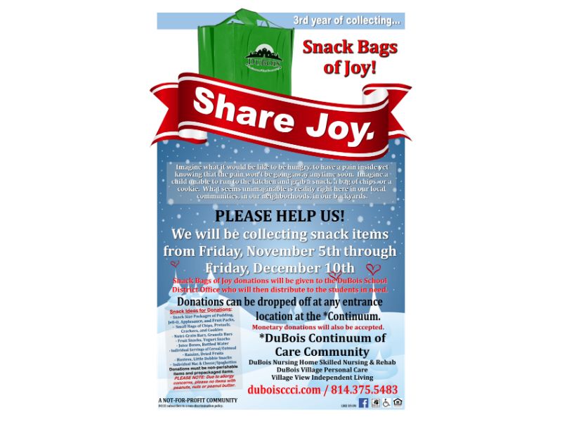 Donate individual snack-size snack items like chips, pretzels, granola bars, juice boxes, bottled water, and more to Save-A- Lot in DuBois now thru Friday, December 10th.